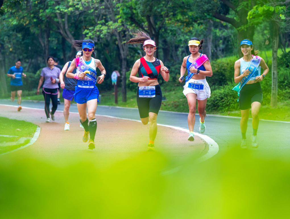 跑步爱好者在广西梧州市玫瑰湖公园参加跑步接力赛。新华社发(何华文摄)