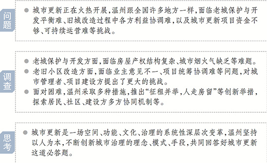 城市更新的诸多难题,是全国各地面临的普遍情况,温州也还在持续破解中。“城市更新是一场空间、功能、文化、治理的系统性深层次变革。”浙江省委党校副教授张红阳认为,要不断创新城市治理的理念、模式、手段,激发各方主体的活力,比如创新投融资模式,完善金融、财税、土地等相关支持政策,鼓励社会资本参与,打造共建共治共享的城市治理模式,共同回答好城市更新这道必答题。