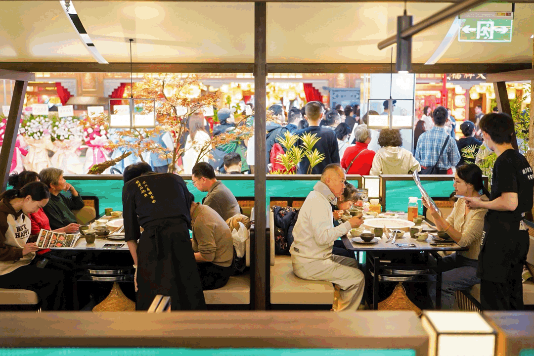 餐饮业态方面,银泰in88四层形成了覆盖多元口味的美食矩阵。走进四层,不同风格的餐饮店格外吸睛,不少店铺门口排起长队,服务人员面带微笑引导客流、热情招待每一位到店顾客,热闹的烟火气十足。