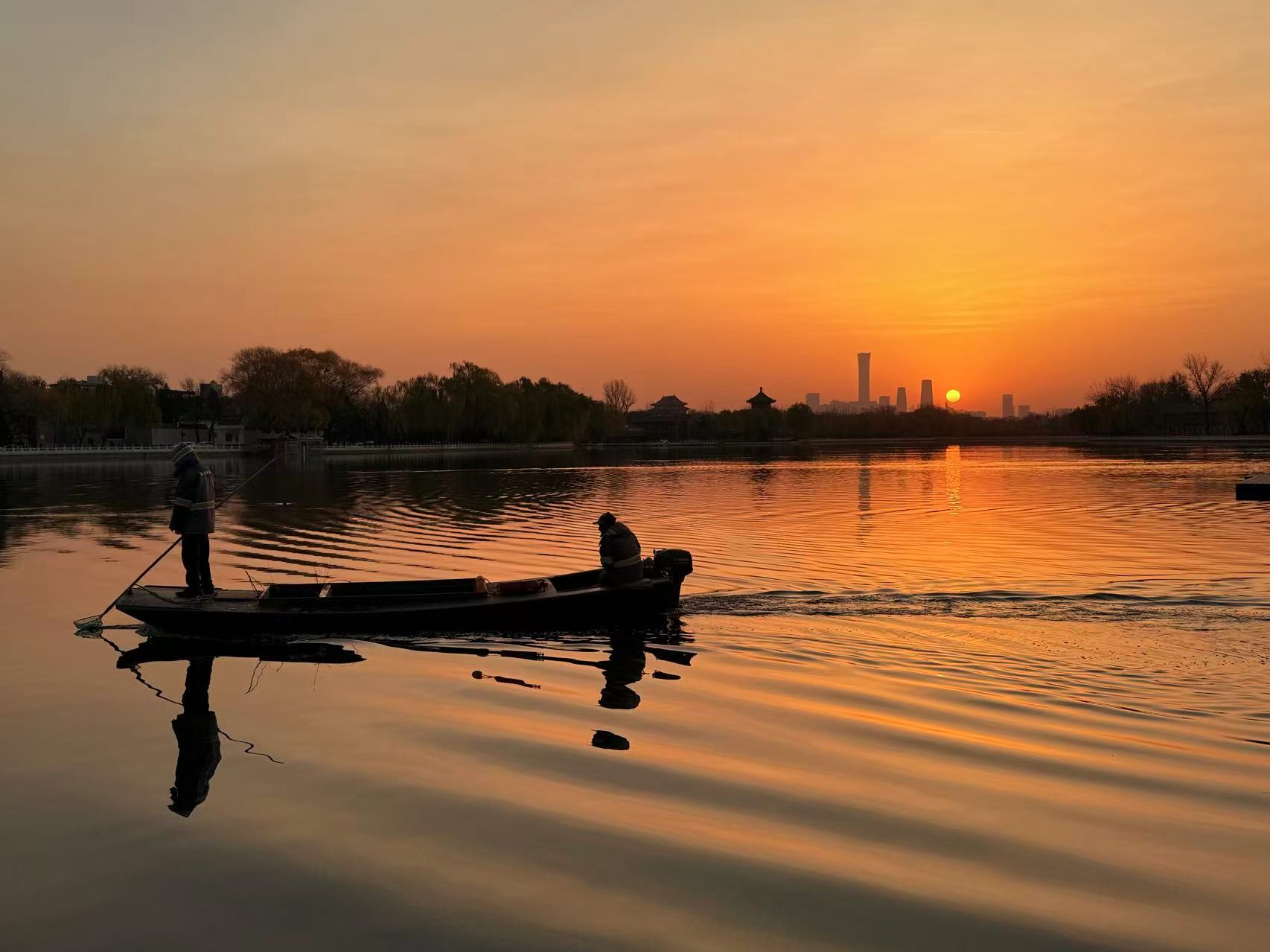 勤者早来,步履轻惊后海梦;冬阳迟照,金光漫染冰湖诗