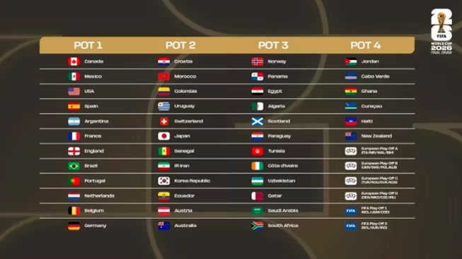 抽签仪式上,首先将把第一档的所有球队抽到A组到L组,其中墨西哥队、加拿大队、美国队确定将在A1、B1和D1位置。然后按顺序抽取第二档、第三档和第四档的球队。值得一提的是,四次世界杯冠军意大利队将参加欧洲附加赛,这意味着“蓝衣军团”如果晋级,将以第四档球队身份征战本届世界杯决赛圈。