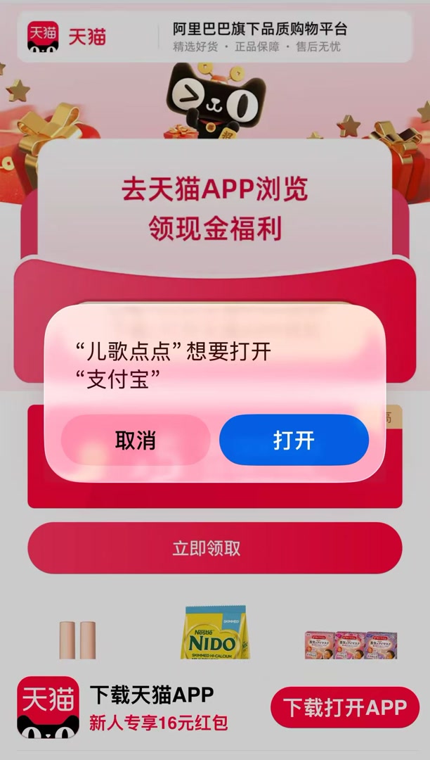 11月18日,记者下载投诉较多的儿歌点点APP进行实测。刚点开应用,开屏广告立即出现,记者稍一动手机,瞬间跳转至天猫页面,同时弹出“儿歌点点想要打开支付宝”的请求。记者选择关闭该请求后,又出现“真的不再看看了吗?”的挽留弹窗。拒绝后记者终于返回主页,谁知又接着弹出一条抖音的弹窗广告。记者尝试上滑页面,竟再次跳转至抖音。如此反复操作近一分钟,才终于进入正常使用界面。