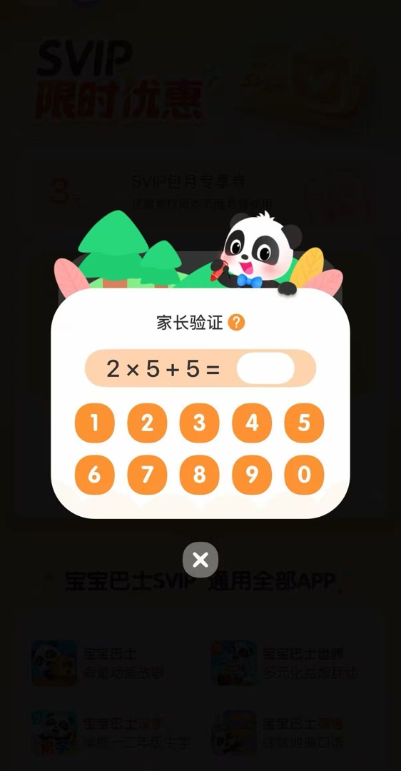 “宝宝巴士”的验证机制同样形同虚设。记者实测发现,点击“加入会员”后,页面默认勾选“SVIP限时优惠”。当记者点击“立即支付”时,界面弹出“家长验证”环节,但仅需解答一道“2×5+2=( )”的算术题。