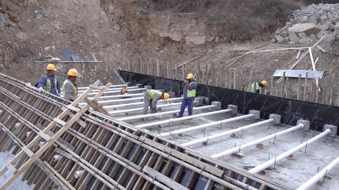 记者在位于王平镇韭园片区的南岳沟施工现场看到,工人们正在紧张忙碌着,对谷坊中的排水管进行加固。