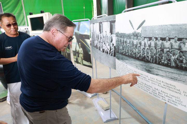 2025年7月16日,美中航空遗产基金会主席杰夫·格林在贵州黄平旧州机场查看飞虎队资料照片。抗战时期,旧州机场主要承担飞机加油、弹药补充和维修任务。常驻于此的美国飞虎队战机频频在该机场起降,参加了湘西会战、衡阳保卫战等著名战役。该机场见证了中美联合反抗法西斯的光辉历史,还为确保“驼峰航线”的顺利畅通发挥了举足轻重的作用。