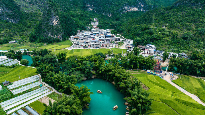 游客乘船游玩贵州省罗甸县沫阳镇大小井景区(2025年8月12日摄,无人机照片)。通过不断升级基础设施、优化服务体系,罗甸县以旅居康养为特色,将丰富的山水资源转化为旅游优势,让“享玩水 趣罗甸”成为夏日品牌,推动全域旅游高质量发展。