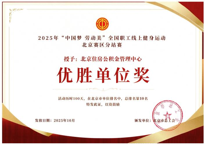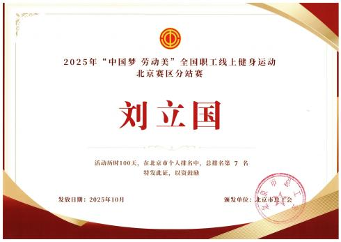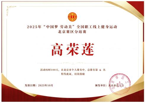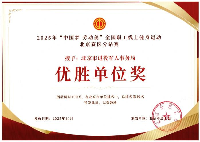 近日,市总工会颁发了2025年“中国梦·劳动美”全国职工线上健身运动北京赛区分站赛获奖证书。北京市直机关工会以全市总排名第3名的成绩,获得优秀组织奖。