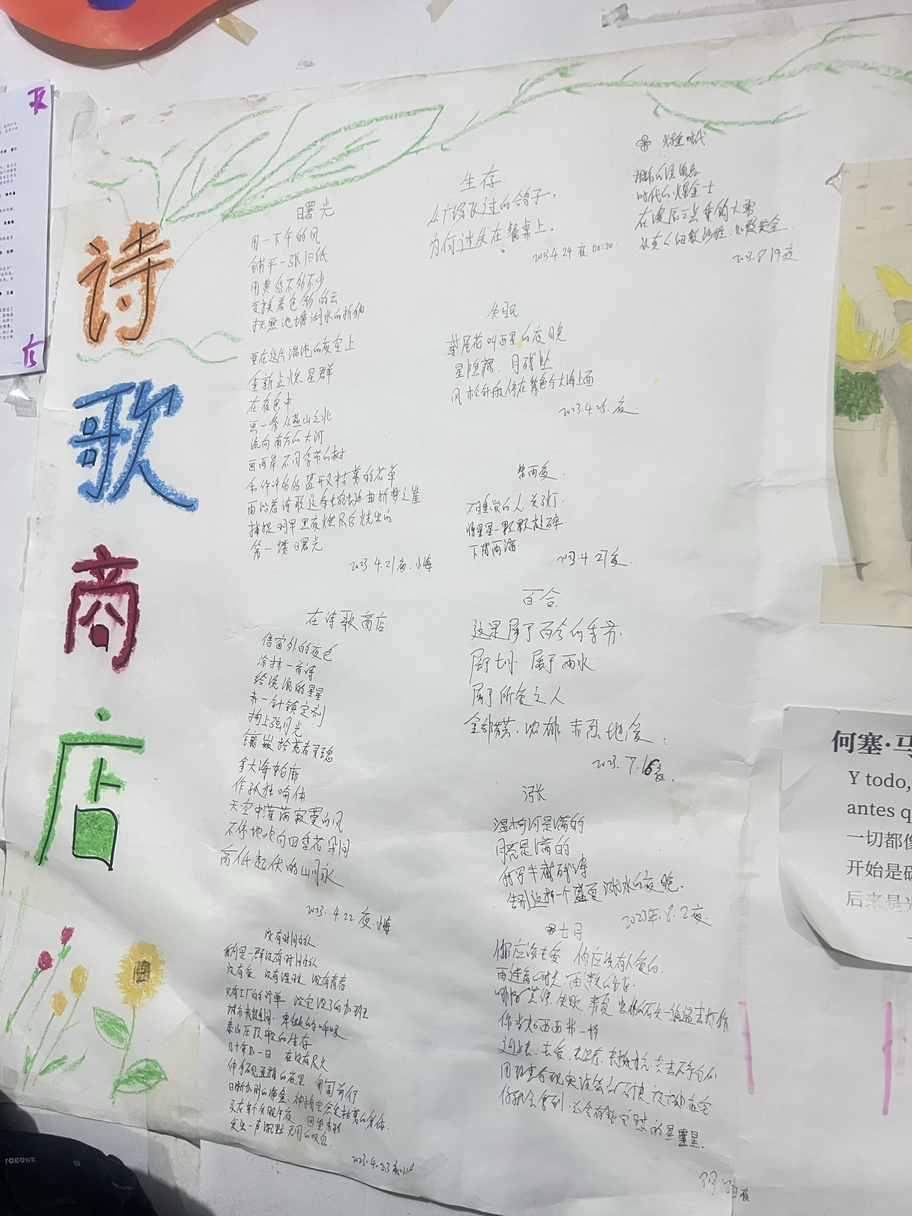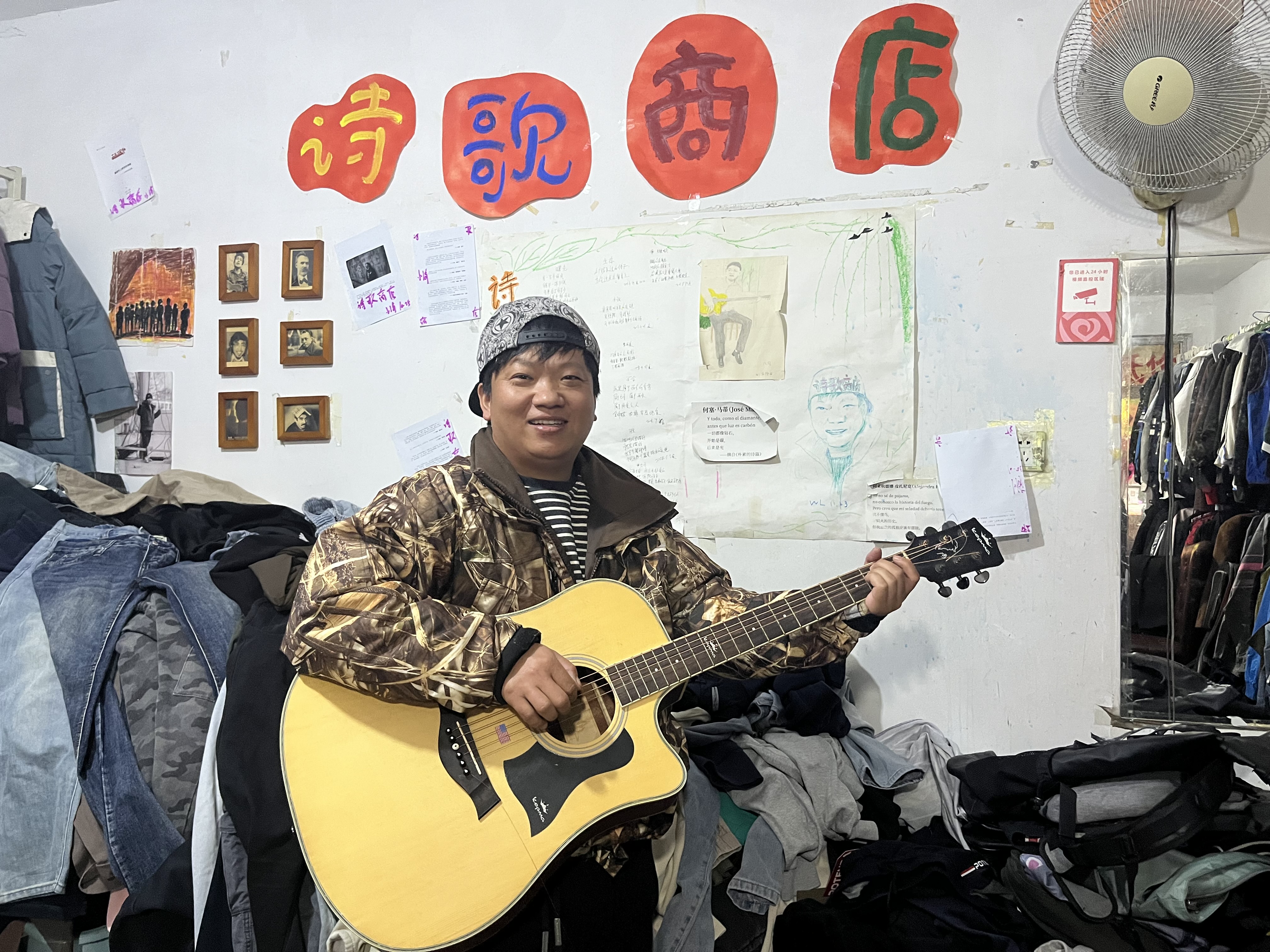 推门而入,迎面而来的“诗歌商店”四个大字下,一面墙上有小海写的好几首诗,“用一下午的风/铺平一张旧纸”,字写得歪歪扭扭,但却是小海对世界、对内心最真切的表达。诗歌墙上还有鲍勃·迪伦、加缪、海子等的小幅照片,每张照片都精心配着相框。18年来,小海一直在用诗歌、用音乐向他的精神偶像致敬,从未停歇,从不懈怠。