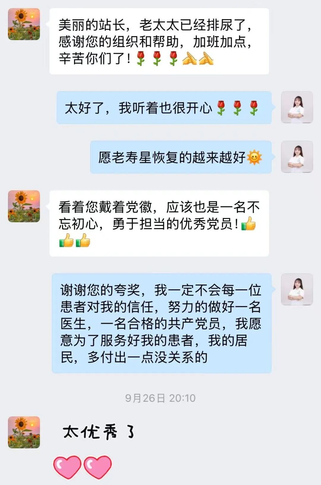 回到站里不久,王静就收到了家属发来的感谢短信,高兴地告知老人已能顺利排尿,“再也不用受尿管折磨了,非常感谢您利用休息时间赶来帮忙,真是比亲人还贴心!”简短的话语充满了对王静、王莹的认可与感激。