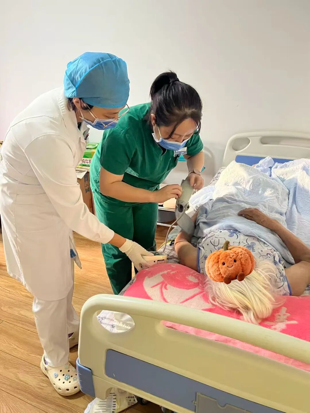 在狭小的房间里,两位医护人员默契配合。王静负责评估指导,王莹则严格按照无菌操作规范,动作娴熟地为老人拔除了尿管。整个过程干净利落,老人甚至还没反应过来,操作就已顺利完成。