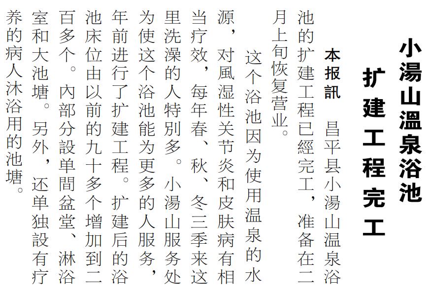 为使小汤山大众温泉浴池能为更多人服务,1958年,这个浴池进行了扩建。扩建后的浴池床位由以前的90多个增加到200多个,内部分设单间盆堂、淋浴室和大浴池。另外,还单独为疗养的病人设置了沐浴用的浴池,洗浴和治病分开。(1963年1月24日《北京日报》2版,《小汤山温泉浴池扩建工程完工》)