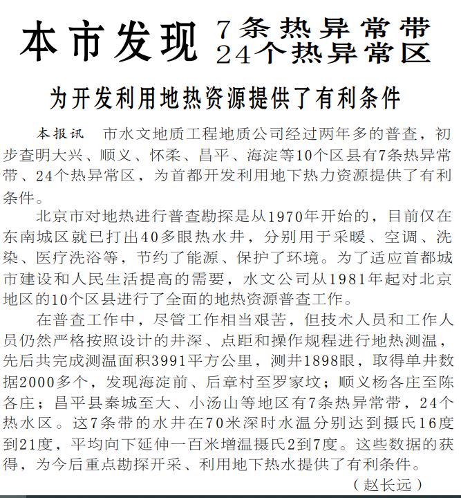 虽然当时本市已经打出了一批热水井,地热资源获得了初步利用,但是利用规模小且效果一般。为了扩大规模、提高效率,北京市水文地质工程地质公司从1981年起对北京地区进行了全面的地热资源普查。经过两年多的普查,初步查明大兴、顺义、怀柔、昌平、海淀等10个区县有7条热异常带(地热带)、24个热异常区(地热区),为首都开发利用地热资源提供了有利条件。(1983年7月22日《北京日报》1版,《本市发现7条热异常带24个热异常区》)