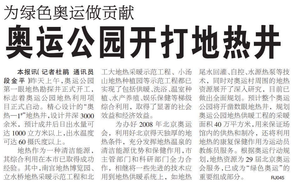 2003年4月28日上午,奥运公园第一眼地热勘探井正式开工,标志着奥运公园地热利用项目正式启动。为办好2008年北京奥运会,利用好北京得天独厚的地热条件,整个奥运公园开凿数眼地热井,地热供暖工程的采暖面积约40万平方米。另外,奥运公园项目还利用地热的康复保健作用为运动员、教练员服务,让中外运动员感受到了北京地热带来的舒适。(2003年4月29日《北京日报》6版,《奥运公园开打地热井》)