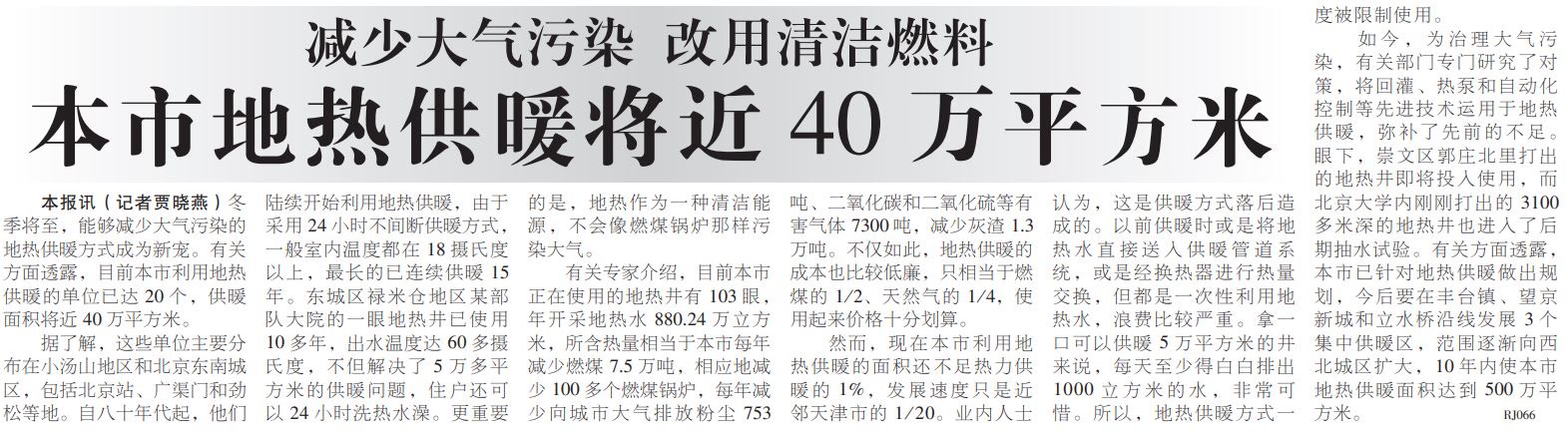 近年来,为保护北京的蓝天,本市持续加大地热资源的开发和利用,不断应用新技术提升地热资源在供热中的比例。
