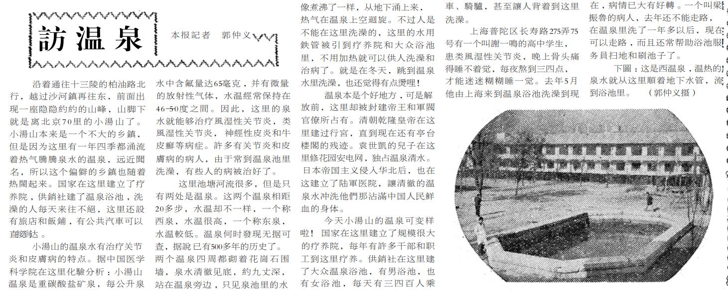 当时,中国医学科学院对小汤山的温泉水做了化验分析,结论为:它是重碳酸盐矿泉,每公升泉水中含氟量达6.5毫克,并有微量的放射性气体。这里的泉水能够治疗风湿性关节炎、神经性皮炎和牛皮癣等病症,因此,许多病人经常到此洗澡。大众温泉浴池不仅提供洗澡服务,还开设了旅店和饭铺,有需求的病人乘公共汽车可以直达这里。据统计,每天到这里洗澡的有三四百人,他们有的乘车,有的骑驴,还有的甚至是让人背着来洗澡的。上海有个高中生患有类风湿性关节炎,晚上骨头痛得睡不着觉,到小汤山温泉浴池洗澡后,病情大有好转。(1959年1月2日《北京晚报》4版,《访温泉》)