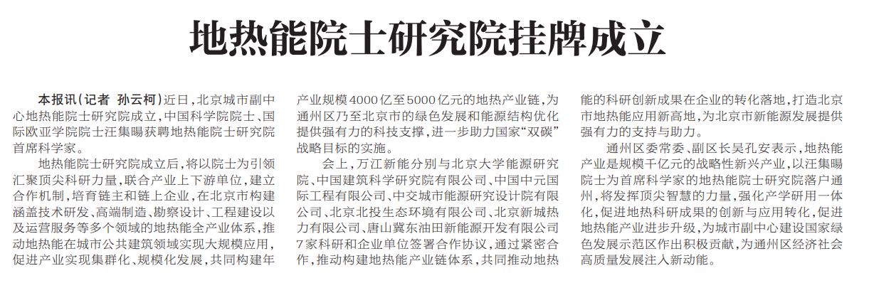 2024年,北京城市副中心地热能院士研究院成立,计划通过构建年产业规模4000亿元至5000亿元的地热产业链,为通州区乃至北京市的绿色发展和能源结构优化提供强有力的科技支撑。(2024年6月12日《北京日报》9版,《地热能院士研究院挂牌成立》)