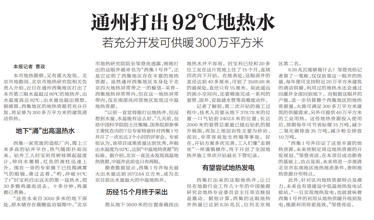 2023年11月,中国石油北京城市副中心0701街区中深层地热供暖项目正式启用。这是本市首个中深层地热供暖试点示范项目,不但可以节约土地资源,还通过100%地热尾水同层等量回灌技术,实现了“取热不耗水”,让水资源可再生利用,为首都冬季供暖增添了“绿色”力量。此后,这项技术得以推广。2023年供暖季,通州区宋庄镇、潞城镇的3000户居民因此享受到了来自地下数千米的温暖。(2024年2月22日《北京日报》12版,《地暖涌动》)