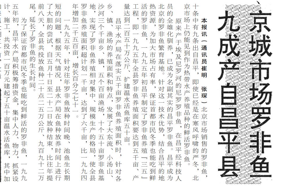 之后,昌平以小汤山养殖为主力,不断扩大罗非鱼的养殖量。很快,罗非鱼就从各大宾馆饭店“飞入寻常百姓家”,丰富了市民菜篮子,成为北京市民饭桌上的“常客”。上世纪90年代中期,北京市场销售的罗非鱼,十条中有九条出自昌平。(1996年1月25日《北京日报》2版,《京城市场罗非鱼九成产自昌平县》)
