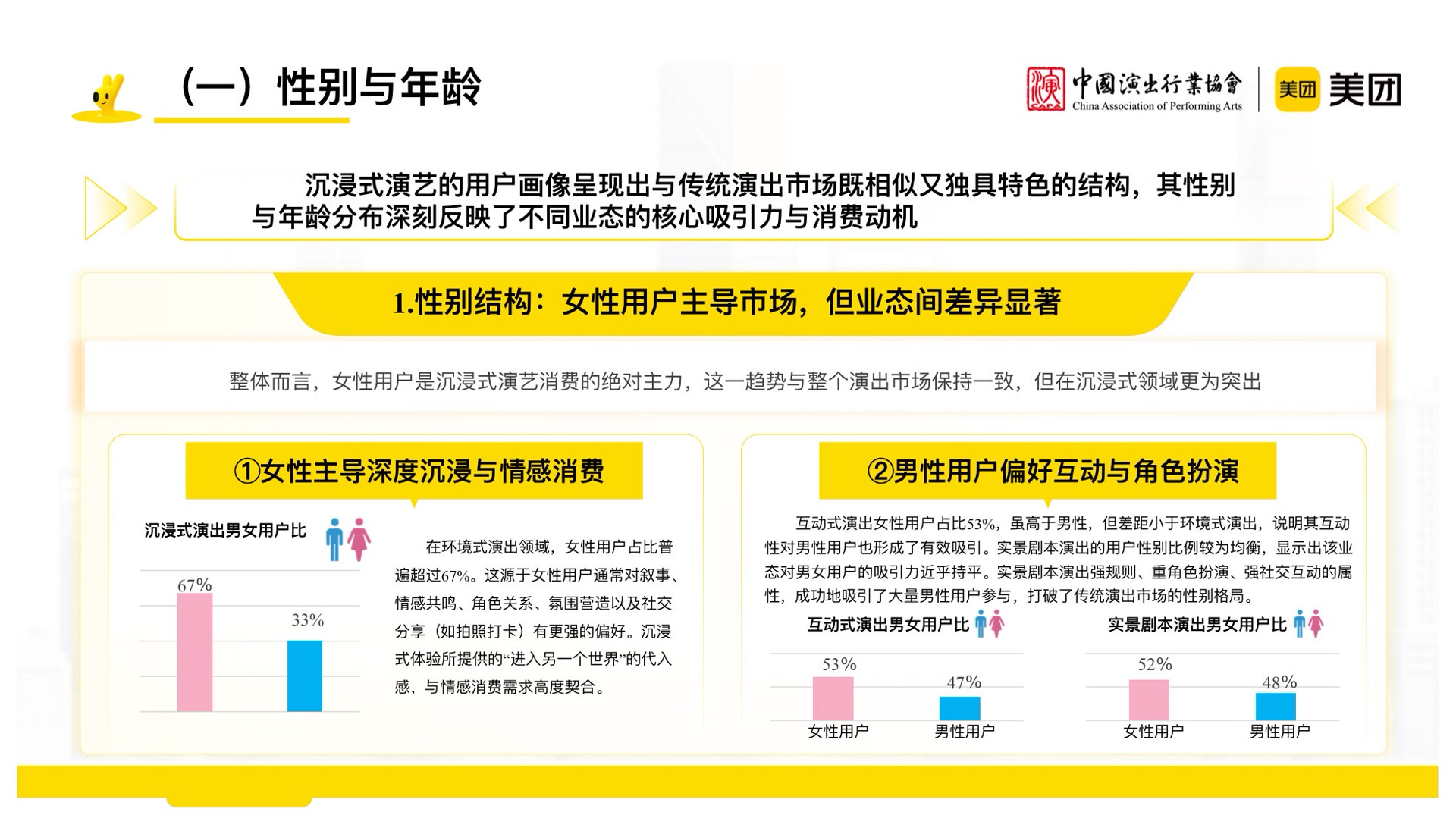 性别结构上,女性观众成为主导,但在不同细分领域又显现出差异。环境式演出的女性用户占比达到了67%,在朱戈看来,女性用户对叙事、情感共鸣、角色关系、氛围营造、社交分享等有更强的偏好,环境式演出所提供的上述的要素,能够与女性的情感消费需求高度契合。“互动式演出和实景剧本演出中男女用户比相对均衡,也就是说,互动式演出的互动性以及实景剧本演出的角色扮演、强社交互动等属性,吸引了更多男性用户参与。”朱戈介绍。
