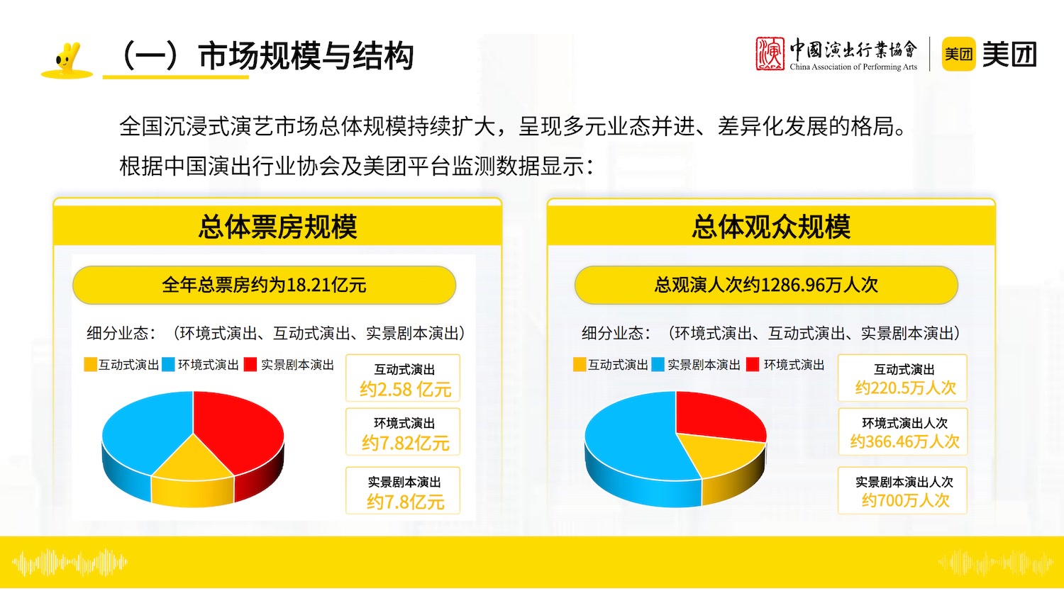 《沉浸式演艺观察报告》是国内第一个沉浸式演艺专项报告,该报告依托中国演出行业协会、美团平台及第三方监测,采集2024年沉浸式演艺市场数据并进行分析测算。报告将沉浸式演艺分为三种类型,其一是将演出空间与观演环境融合,使观众身临其境于故事世界的环境式演出;其二是演员可以与观众直接进行互动,影响剧情发展的互动式演出;其三是演员和观众都可以扮演剧本游戏的角色来推进剧情,真正让玩家做到身临其境的实景剧本演出。