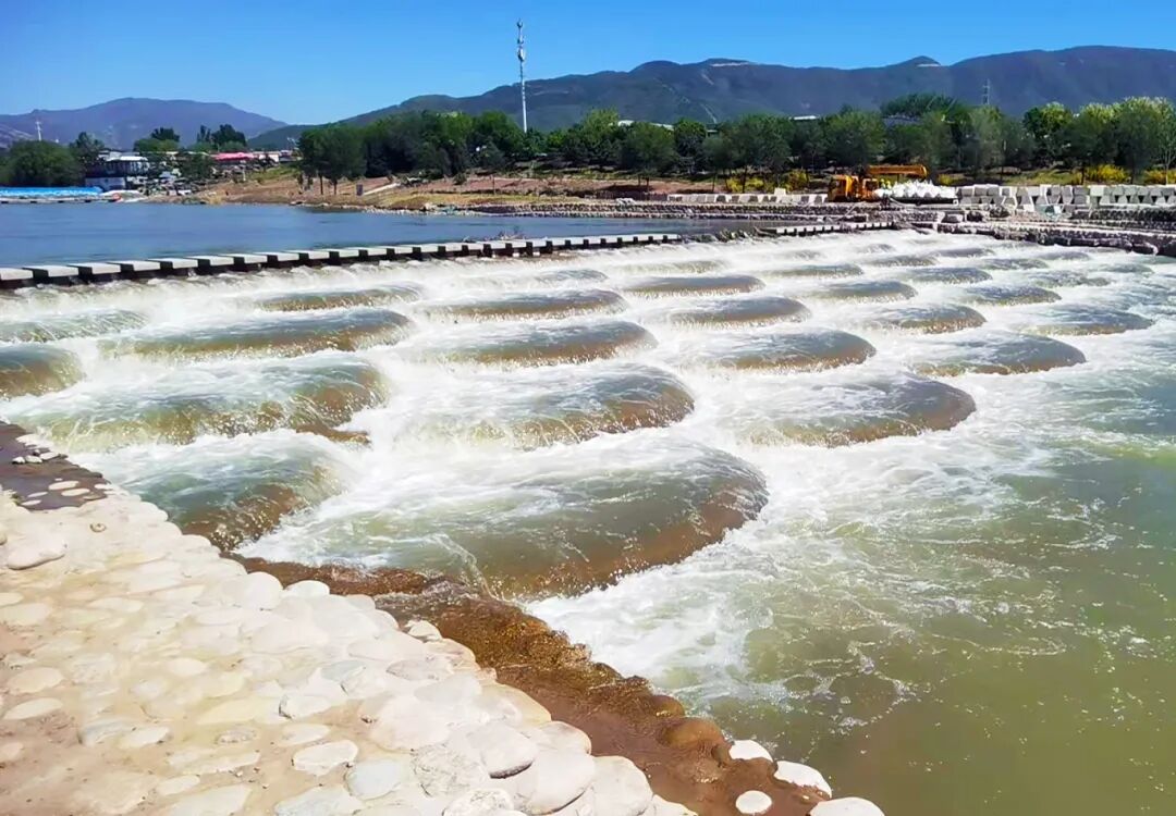 在莲石湖跌水修复施工现场,河道岸坡已被修葺一新,湖中央设计的三级围堰跌水结构,通过高低落差的层次感减缓上游水流流速。而在门城湖的鱼鳞跌水,则是通过阶梯式的鱼鳞结构实现水流消能。