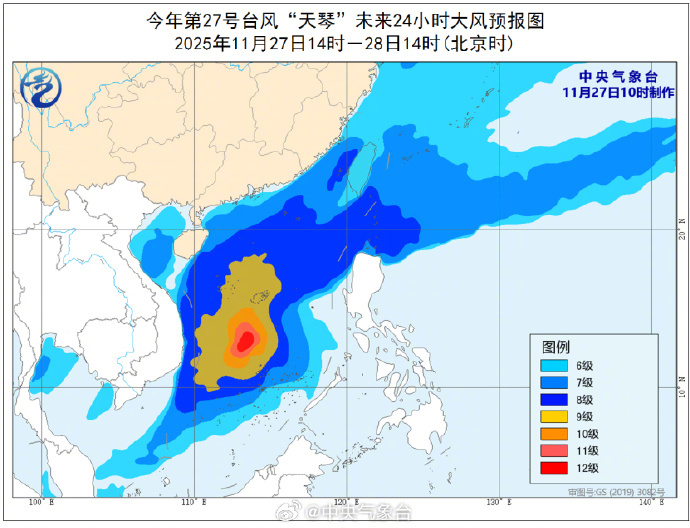 今天到明天,受台风和冷空气的共同影响,台湾海峡、巴士海峡、台湾以东洋面、南海大部及东沙群岛、西沙群岛、中沙群岛、南沙群岛、黄岩岛附近海域、北部湾、台湾沿海、福建沿海、广东沿海、海南岛东部沿海将有6-8级大风,其中南海中部和南部部分海域风力可达9-10级,“天琴”中心经过的附近海域风力可达11-12级,阵风13-14级。
