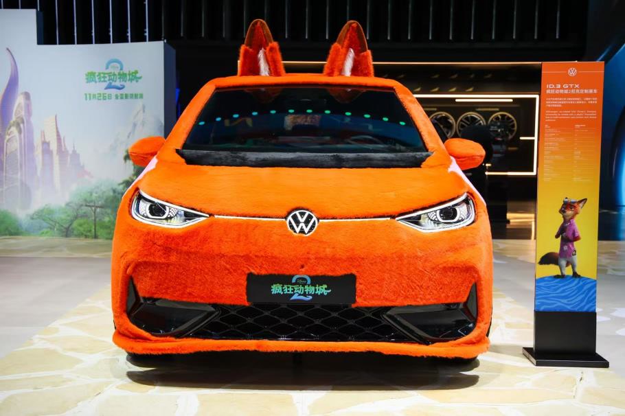 近日,大众汽车与迪士尼《疯狂动物城2》 官宣全球合作,上汽大众也在广州车展现场呈现了一款ID.3 GTX疯狂动物城2尼克定制展车,抓人眼球的亮橙色涂装、趣味十足的主题造型为车型注入新鲜活力,引来这部超级大作的粉丝争相前来打卡互动。