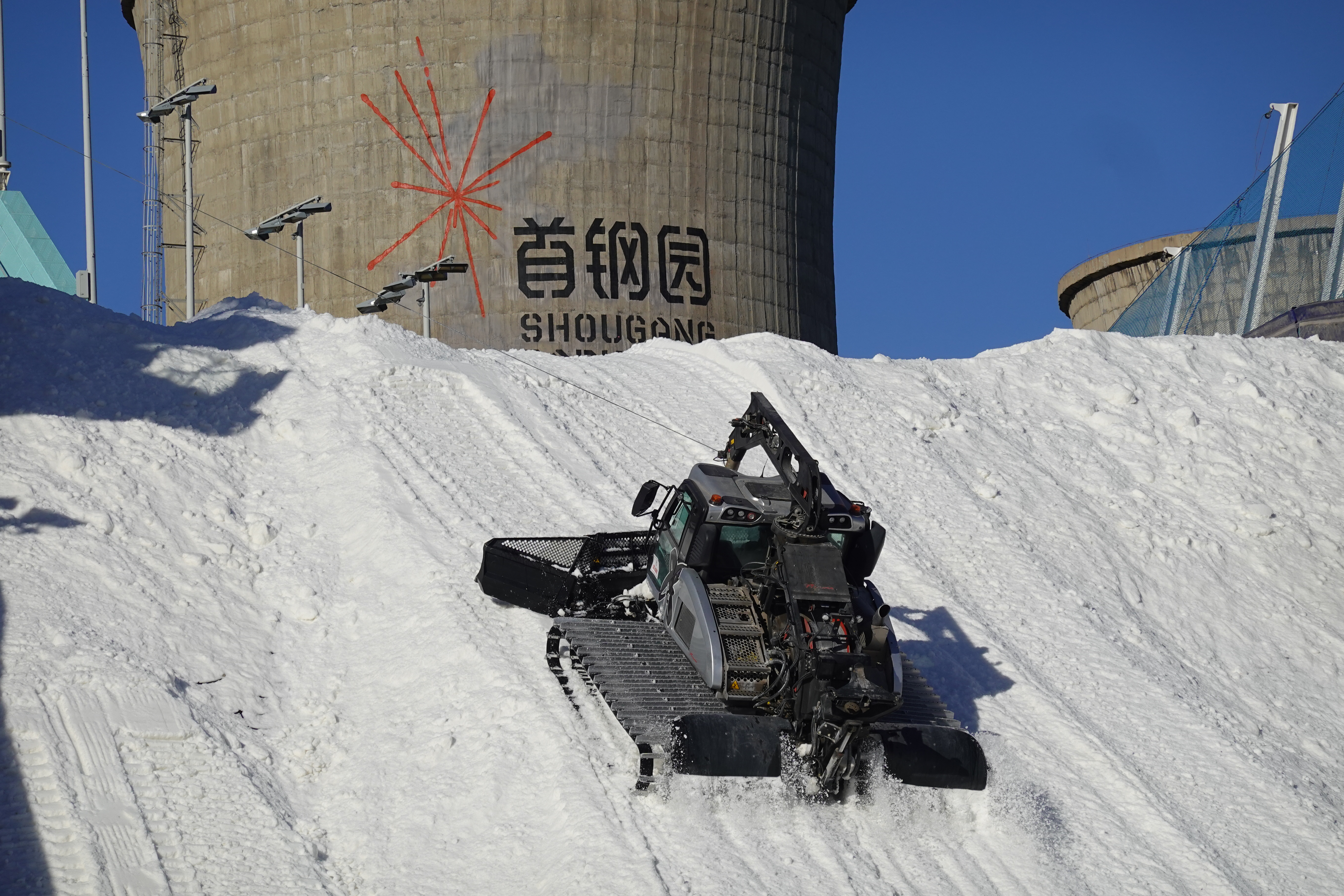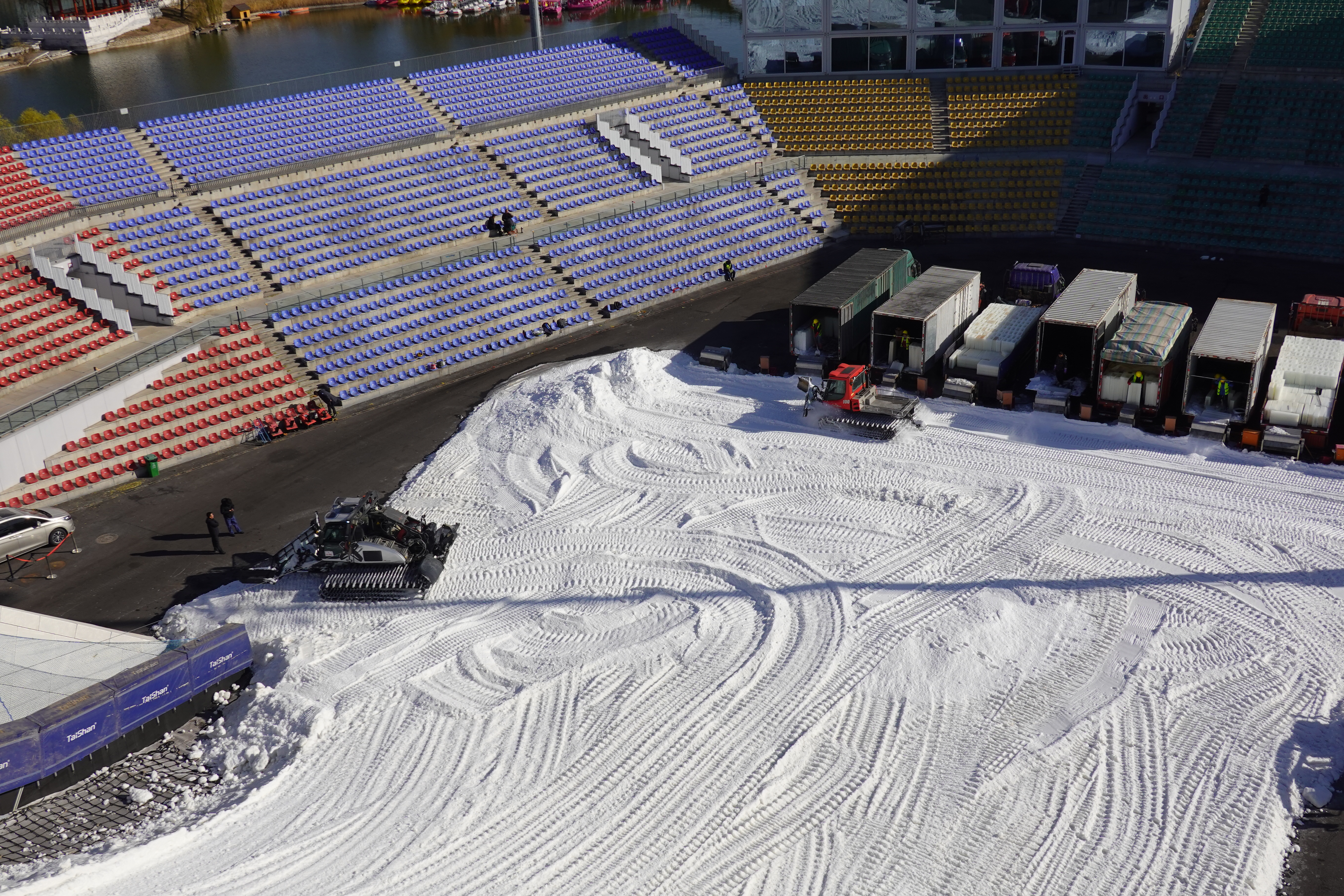 11月27日,首钢滑雪大跳台现场,赛道的造雪量已累计完成约6500立方米。根据安排,今日将是最后一天碎冰造雪,总造雪量预计将突破7000立方米。