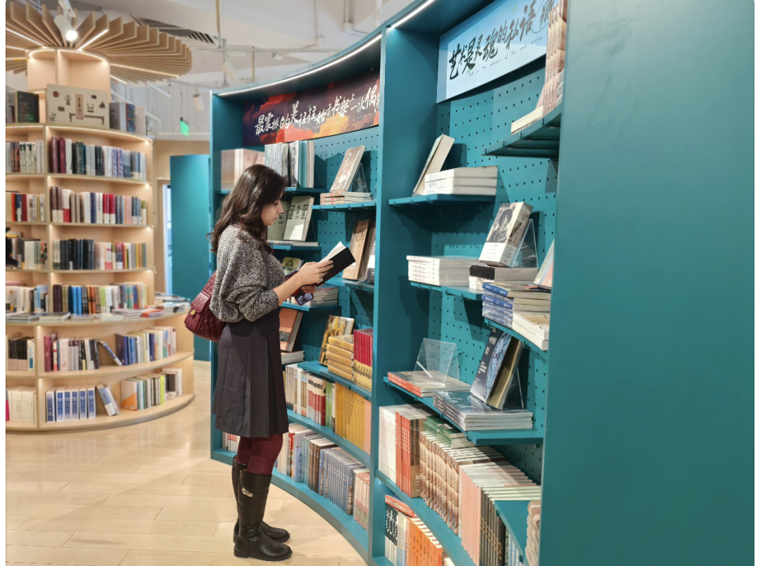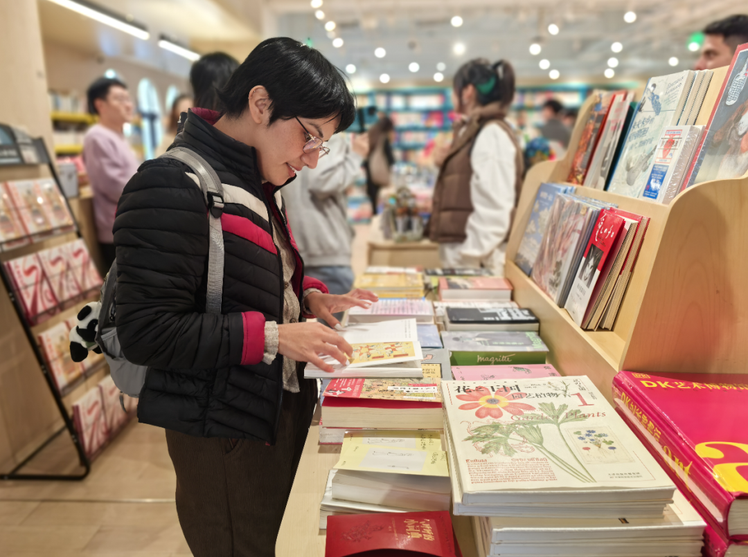 一位留学生在文化类书架前驻足良久,拿起一本配有插图的中国古典服饰书籍,饶有兴致地翻看着。“我妈妈对中国古典服饰文化很感兴趣,虽然很多字词还不能完全理解,但通过图片和简单的注释,能感受到其中的美感。”她通过翻译告诉记者,这样安静舒适的阅读环境,让她能静下心来感受中国文化的魅力。