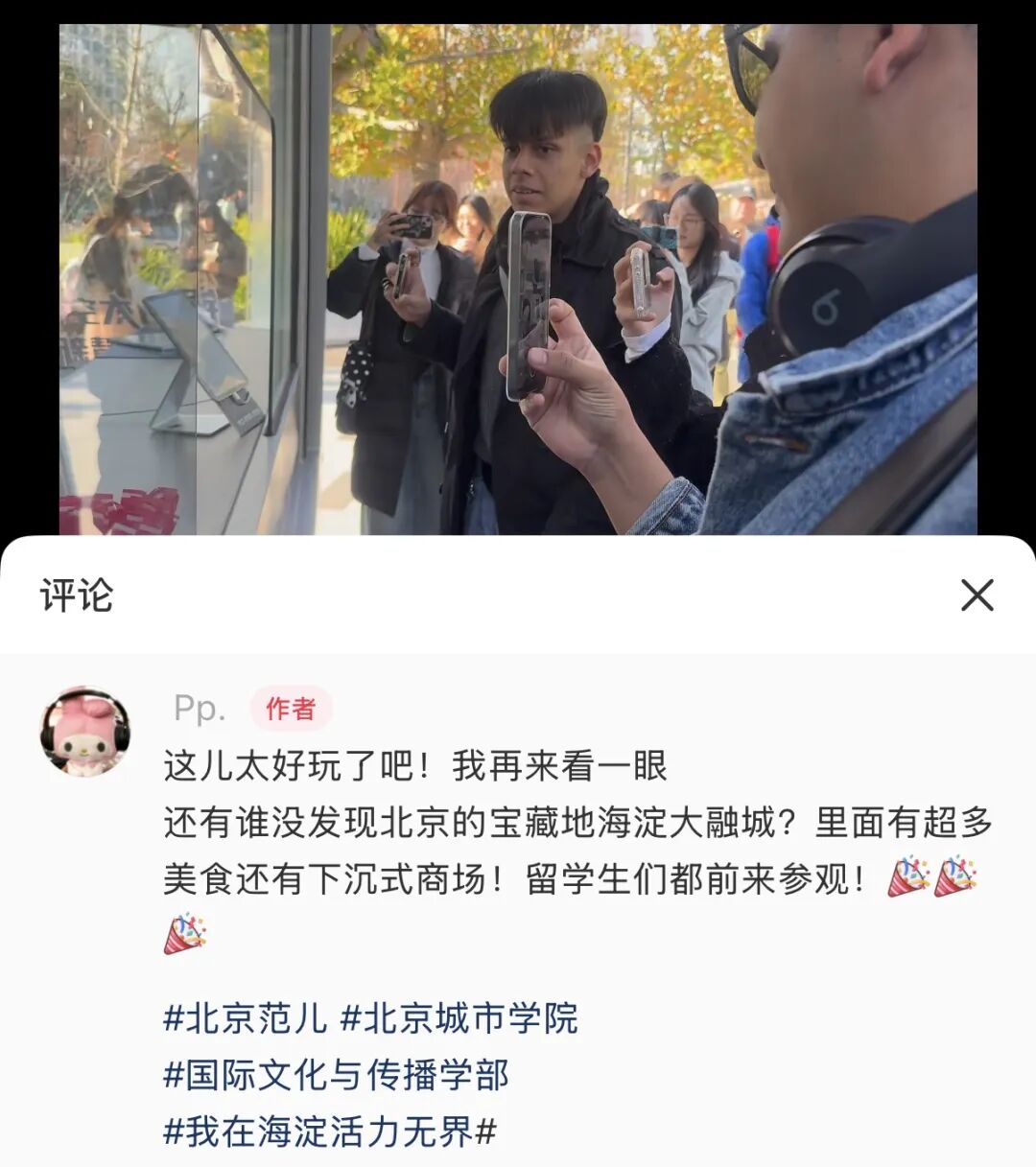 11月22日,区融媒体中心携手北京城市学院,组织近30名中外学子走进北京中关村ART PARK大融城(西区)、风入松书店及北京中关村领展广场,用脚步丈量城市肌理,用镜头捕捉商业脉搏,用交流碰撞文化火花,让“海淀光影朋友圈”在中外青年的共同描绘下,绽放出更加鲜活的魅力。