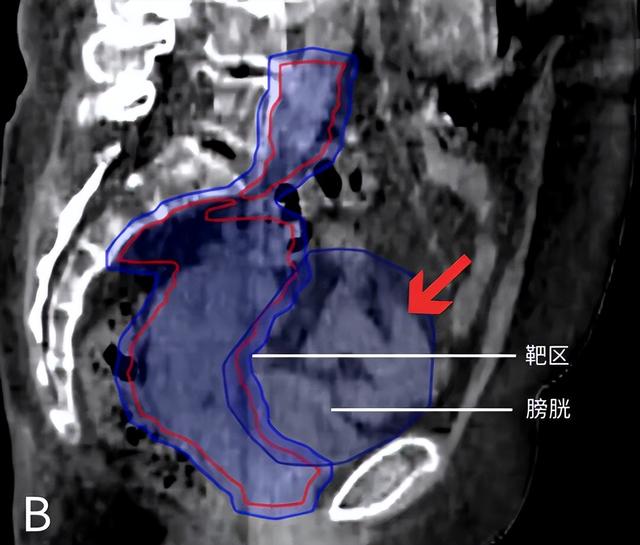 图为宫颈癌患者的矢状位图像。图A为计划CT,憋尿良好,肠道被推挤出盆腔;图B为治疗时的CBCT图像,憋尿较差,更多的肠道(红色箭头指示部分)进入照射区域。