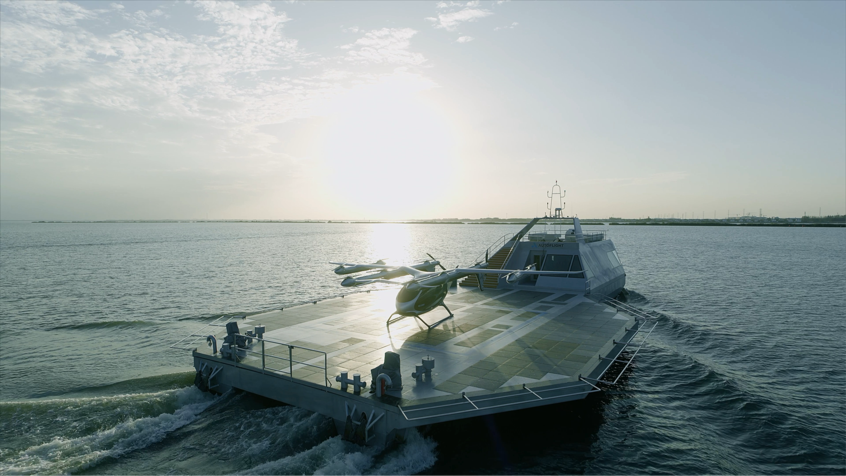 该机场专为eVTOL航空器设计,采用纯电驱动模式,宽大甲板铺设光伏板作为起降平台,船舱则改造为候机厅与机务室,既能满足eVTOL起降及充电需求,又能与航空器实现数据共享和智能协同。