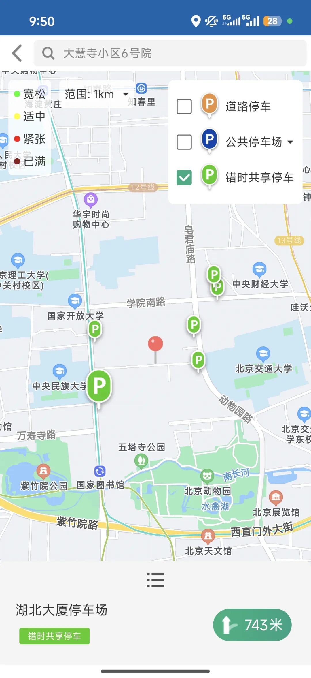 市民可通过“北京交通”APP“停车服务”中的地图查询功能,勾选“错时共享停车”专题,输入目的地,即可查询周边有偿错时共享停车场信息,包括具体位置、共享车位数量和联系人电话等。相关信息也同步在“北京静态交通共享停车”小程序发布。