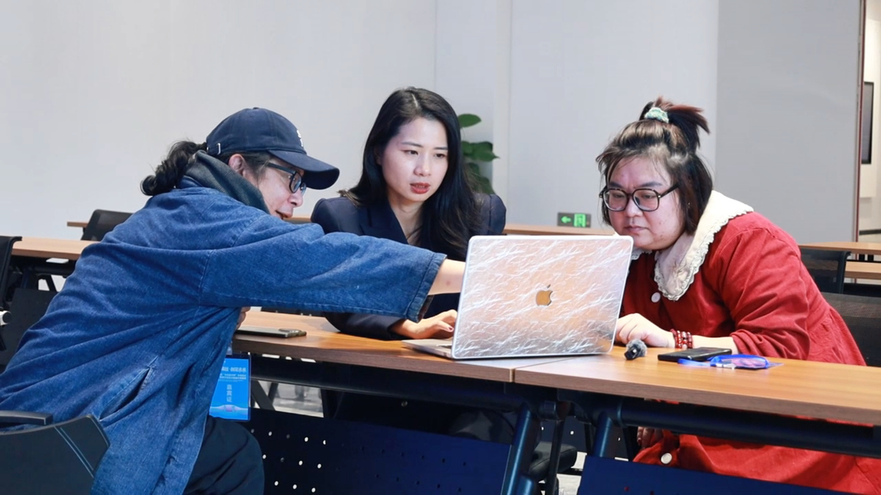 “不等明天”成员乌米、丽米、紫米(左起)正在讨论AI创作。潮新闻记者 刘琨 摄