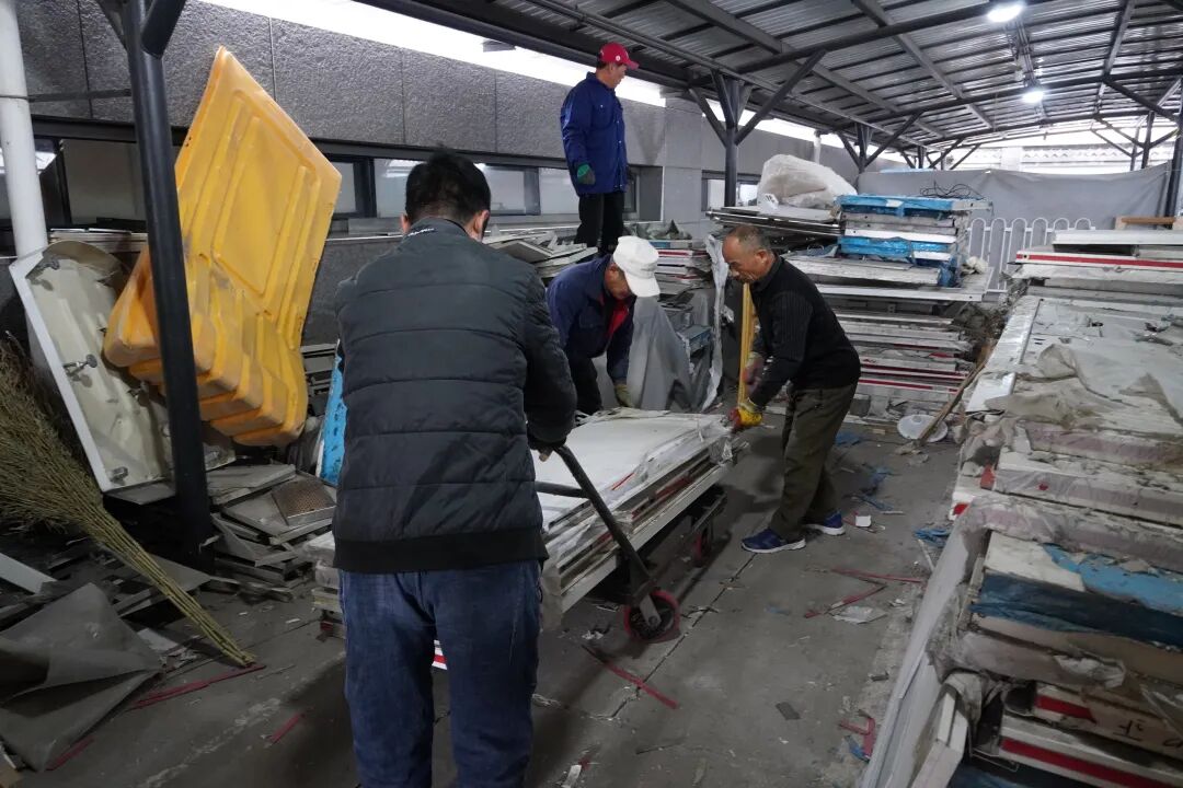 协和医院物业工作人员清理医院内部急诊西侧非机动车停车棚摆放的杂物。