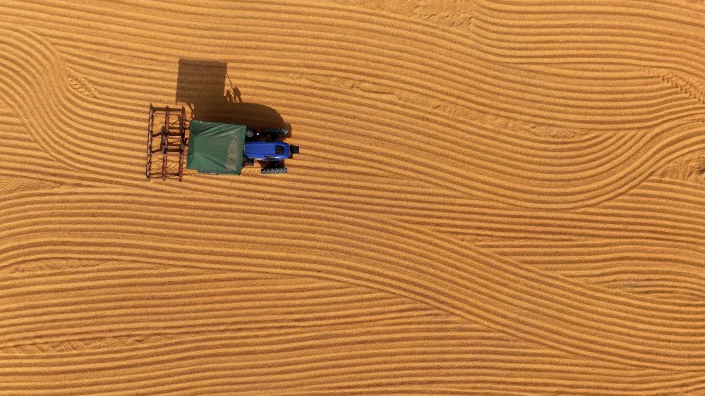 在新疆昌吉回族自治州奇台县西北湾镇,农户在田间收获小麦(2024年7月9日摄,无人机照片)。新华社记者 丁磊 摄