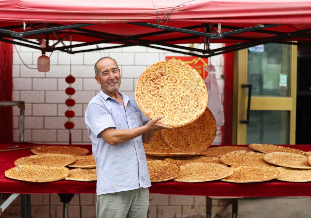 2025年7月21日,在新疆库车市,传统面食制作技艺(馕制作技艺)国家级非遗代表性传承人热西提展示他制作的馕。新华社记者 王婧嫱 摄