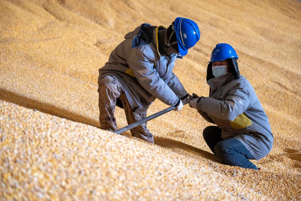 2025年10月31日,在黑龙江省双鸭山市的中粮天兴物流园区仓储库,工人进行扦样作业,了解储存仓内大豆水分、杂质以及虫害等情况。新华社记者 张涛 摄