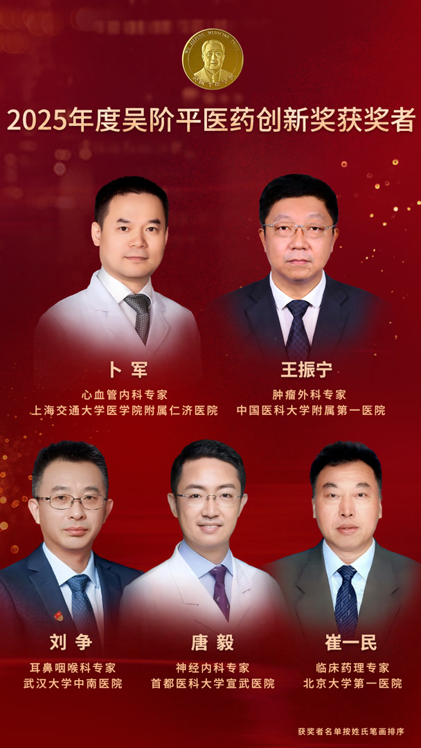 2025年度吴阶平医药创新奖授予心血管内科专家卜军教授、肿瘤外科专家王振宁教授、耳鼻咽喉科专家刘争教授、神经内科专家唐毅教授、临床药理专家崔一民教授,以表彰他们在各自的学科领域作出的重要贡献。