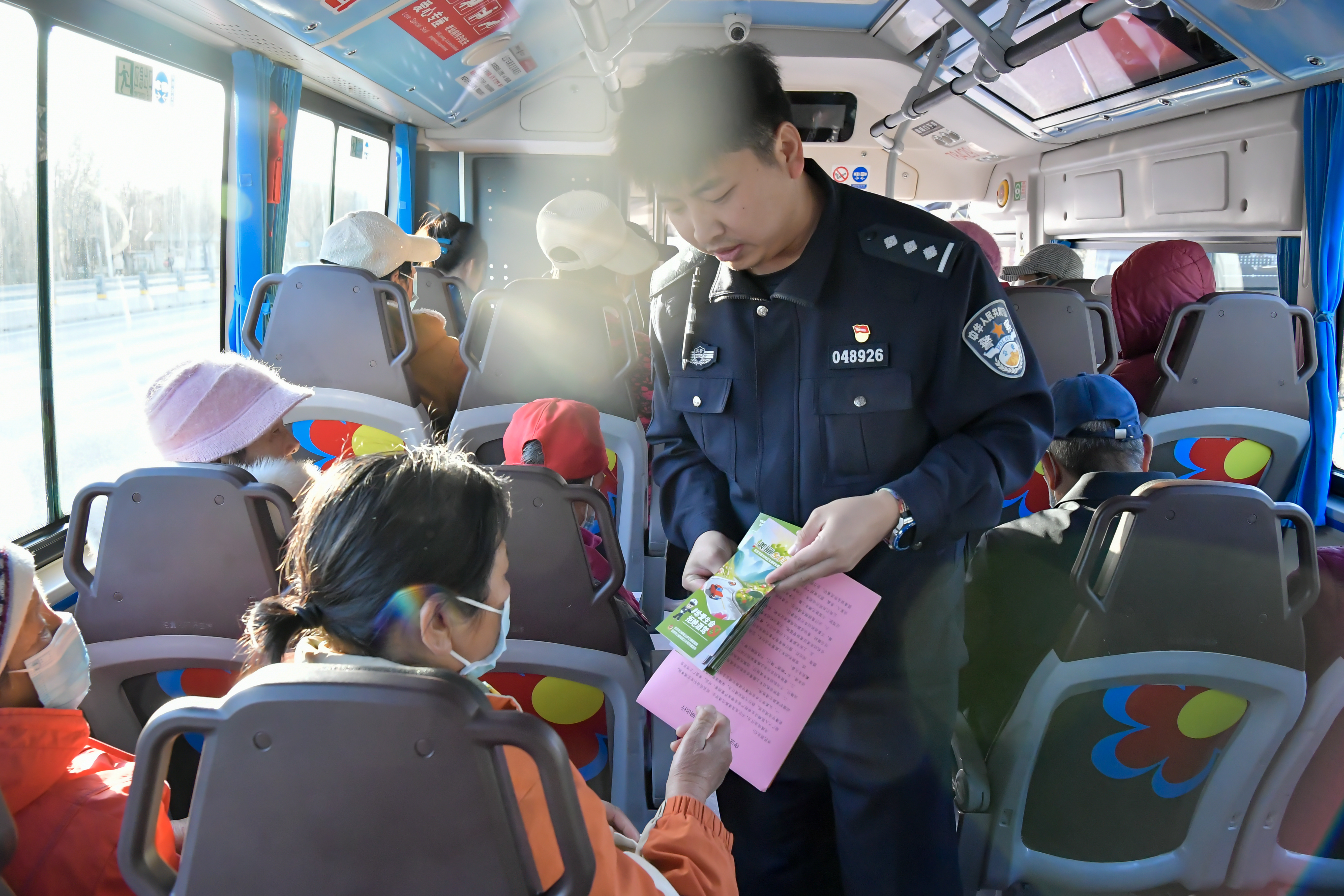 活动中,4辆喷涂有“全国交通安全大篷车”彩绘的公交车从通州区东夏园综合交通枢纽启程,一路穿行30余个村庄与地铁站点,随车交警边走边讲,向乘客、村民递上宣传资料,用通俗易懂的语言拆解酒驾醉驾、无证驾驶等常见交通违法的危害,细致讲解安全防护要点,现场互动氛围热烈。