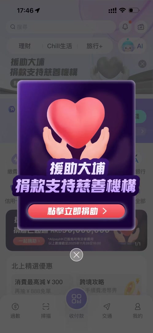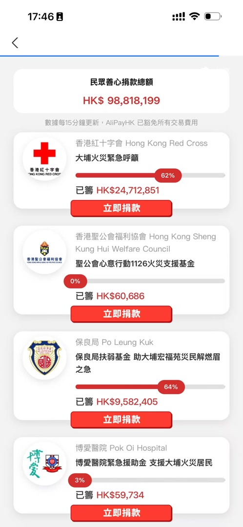 11月28日,为支援香港大埔火灾救援,协助受影响的居民早日渡过难关,各慈善机构、社区组织及地区团体已迅速启动支援行动,发起应援慈善项目。WeChat(微信)香港钱包、Alipay HK(支付宝香港)等上线捐款专区。