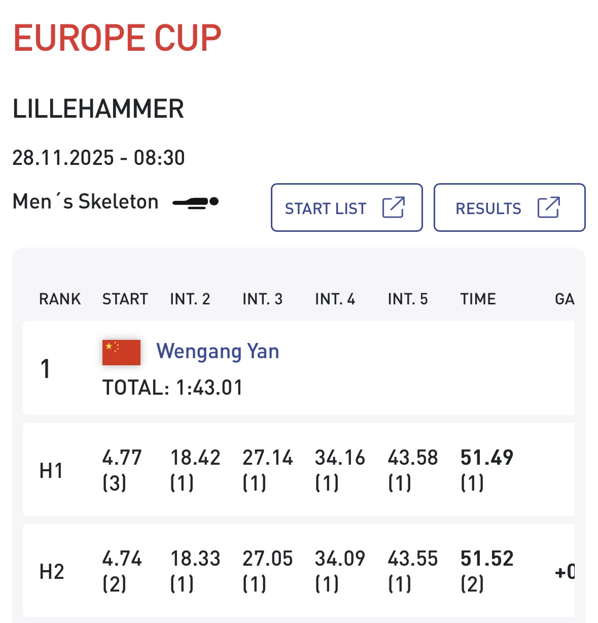 北京时间11月28日,2025至2026赛季国际雪车联合会钢架雪车欧洲杯在挪威利勒哈默尔举行,中国选手闫文港表现出色,以总成绩1分43秒01勇夺男子组钢架雪车冠军,摘得个人本赛季首枚金牌。