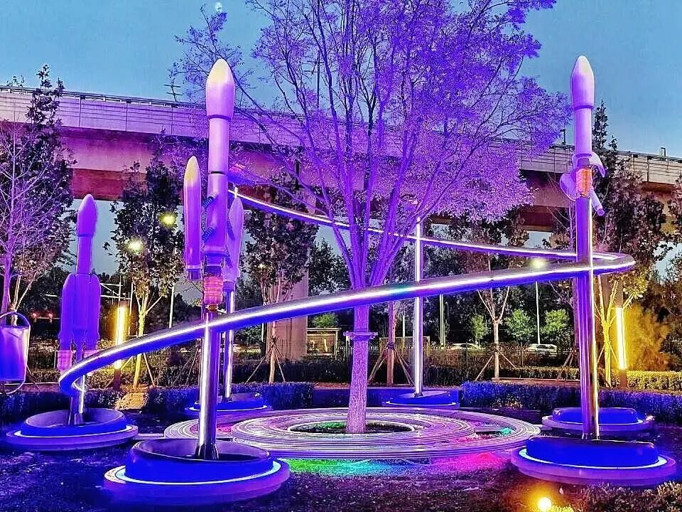 再往里走就能看到“C位担当”——“星箭之树”。6米高的螺旋结构向上攀升,火箭腾空和卫星入轨的场景跃然眼前。夜幕降临时“星箭之树”被点亮,也照亮了每个追梦者的星空遐想。