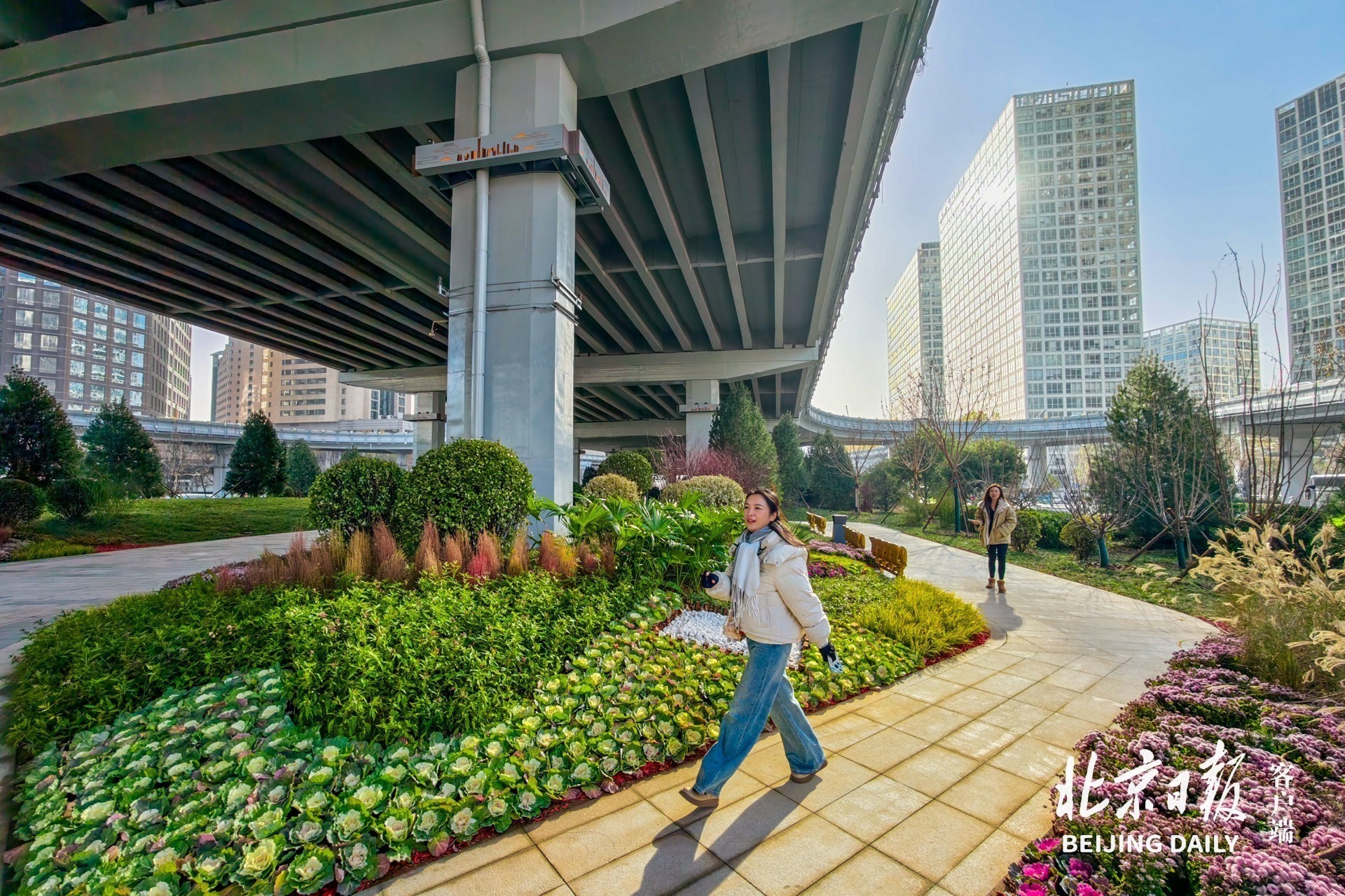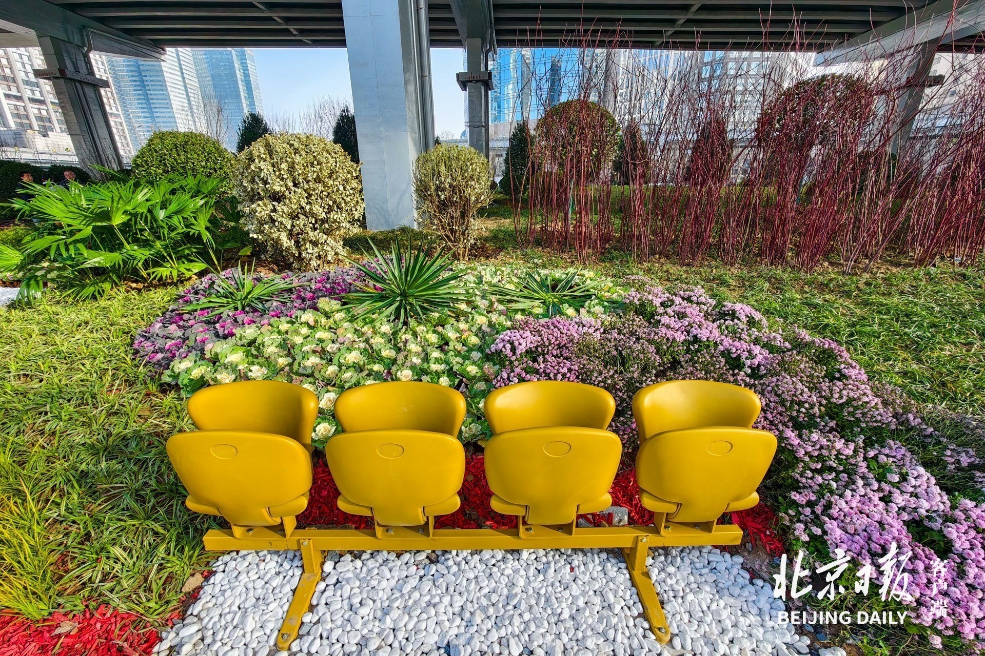 天冷了,桥下又少光,能有绿化景观实属不易。“为了打造绿化景观,我们精选了耐阴、耐寒植物,同时做到层次错落有致。等到了春季,我们还会更换色彩更艳丽的花卉,将桥区装扮得更美丽。”朝阳区城市管理委员会副主任钟鎛介绍,桥下廊道还布设了夜景照明系统,夜晚漫步又是另一番景色。如果走累了,市民还可以在花间的临时座椅上休息,这些金色阅兵观礼椅与环境协调相融。