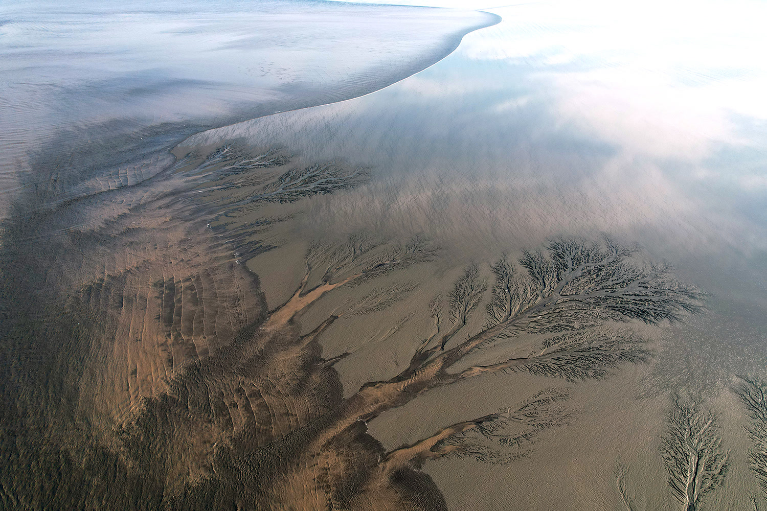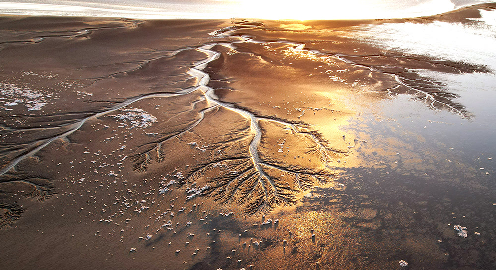 钱塘江“潮汐树”,并非真正的树木,而是江中沙洲或近海塘滩涂上的一种奇特地貌。它是在潮汐的反复冲刷下勾勒出的复杂多变图案,如同长在沙洲或滩涂上的一棵棵巨大树枝,脉络清晰,形态逼真,肆意伸展,充满了生命的张力与艺术的韵律。