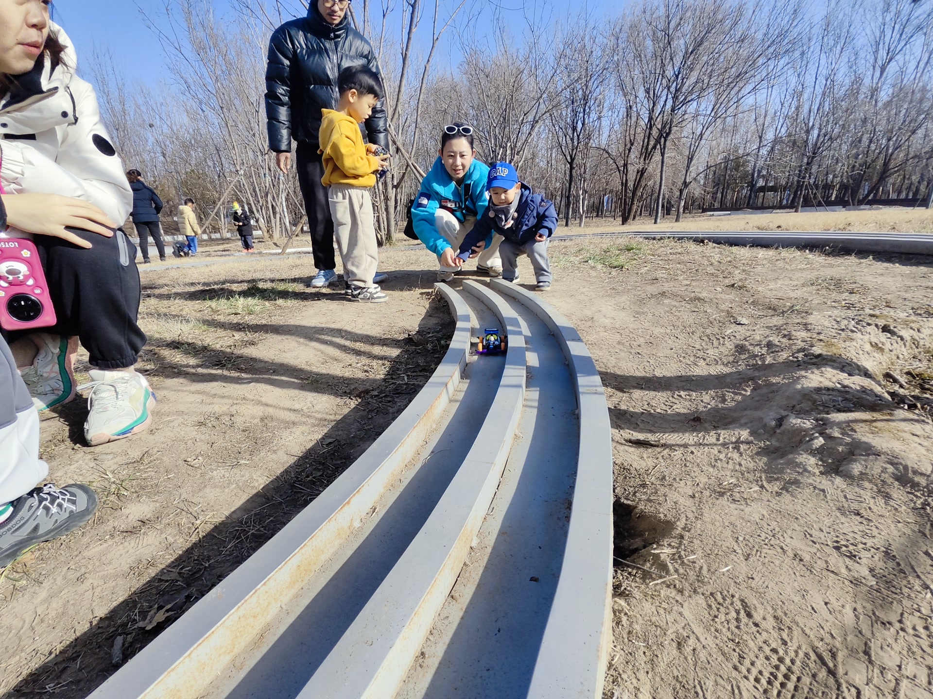 还有不少带着孩子来逛温榆河公园的家长,偶然发现了这片“童年回忆宝地”,二话不说就拿起手机开始选购四驱车。一位家长表示:“小时候大家都有四驱车玩具!但那时候哪里有赛道,都是瞎玩,这里竟然有免费的赛车跑道,太难得了。而且孩子也喜欢,等四驱车一到货我马上带孩子来玩!”