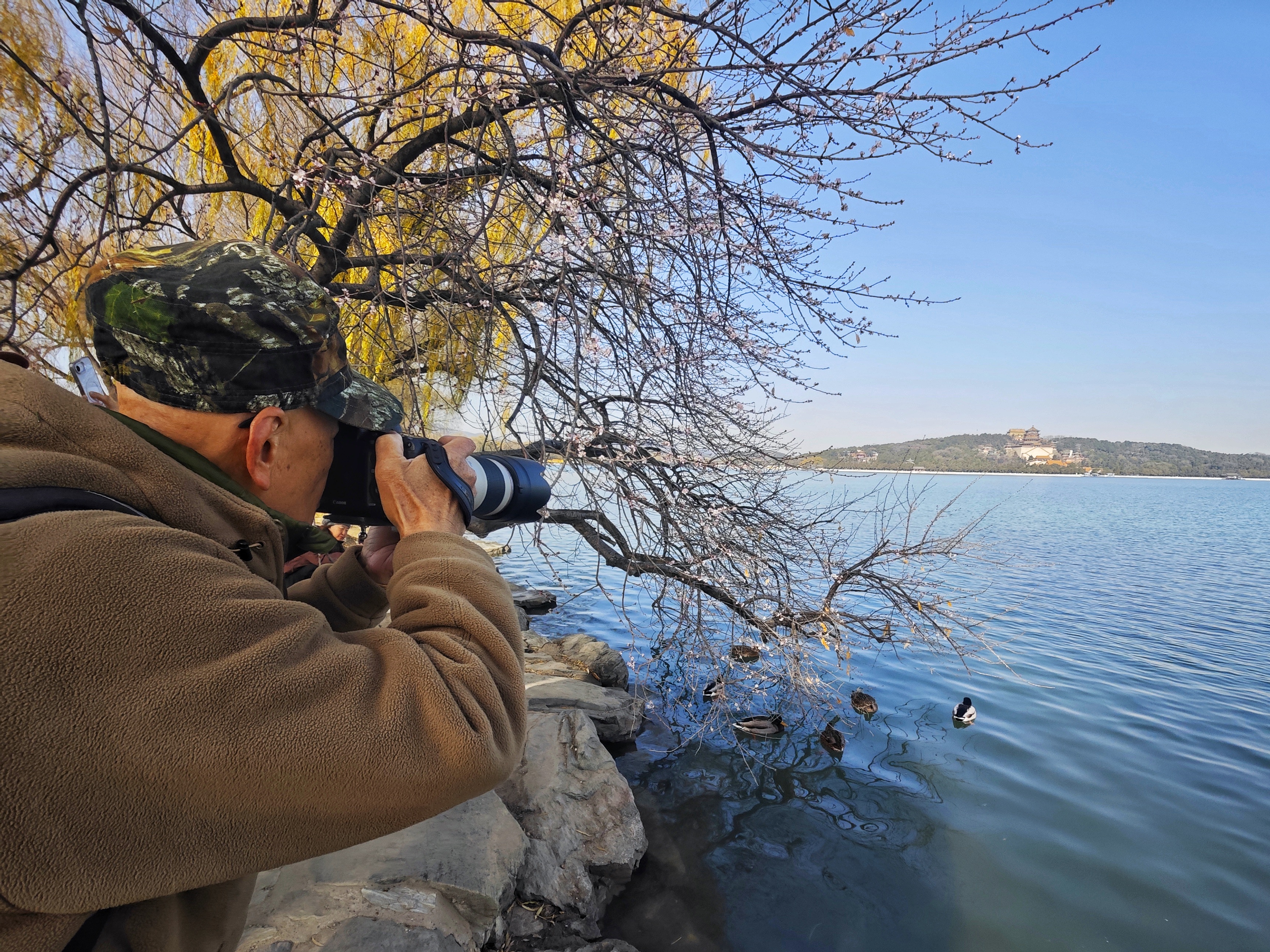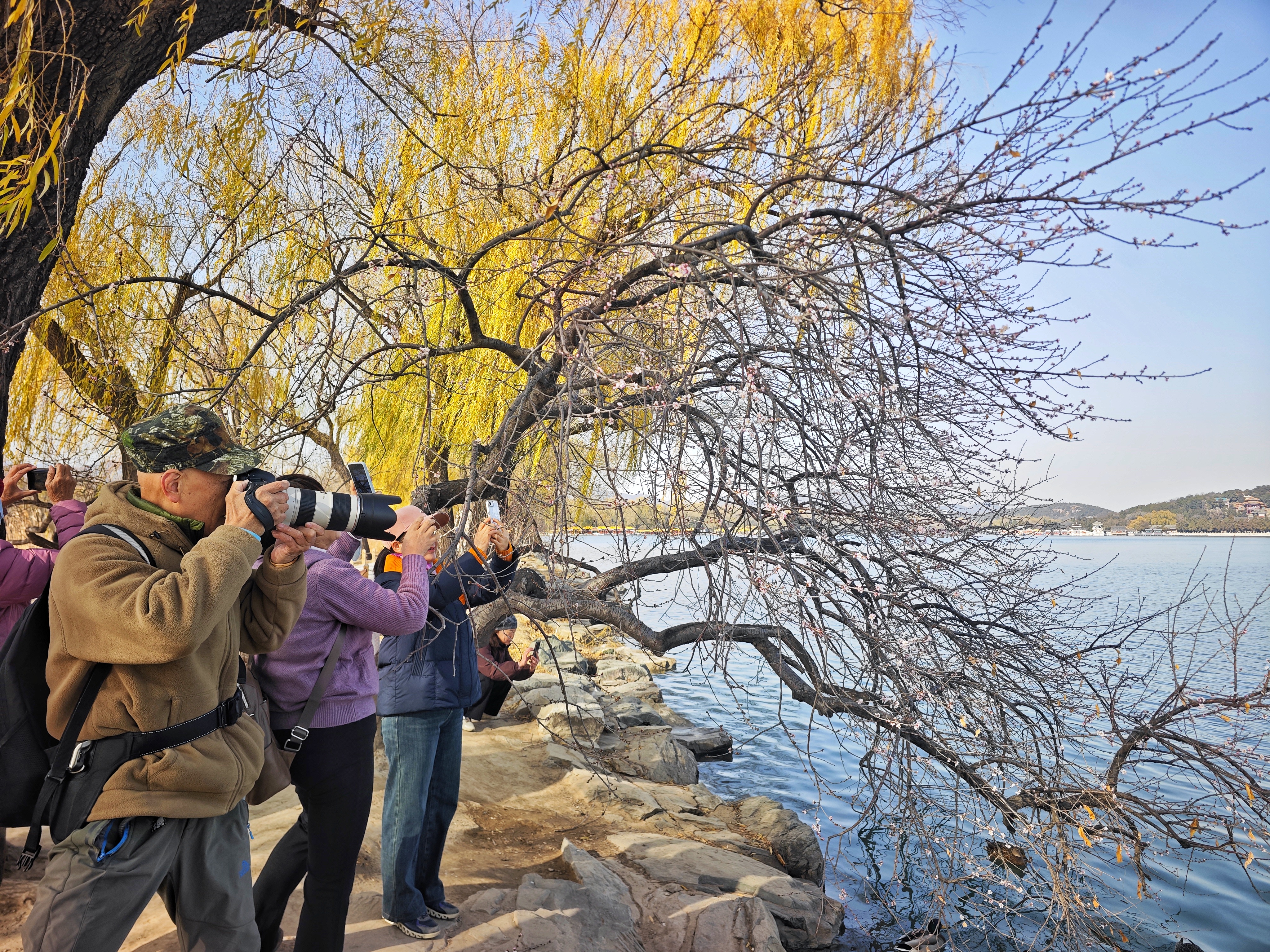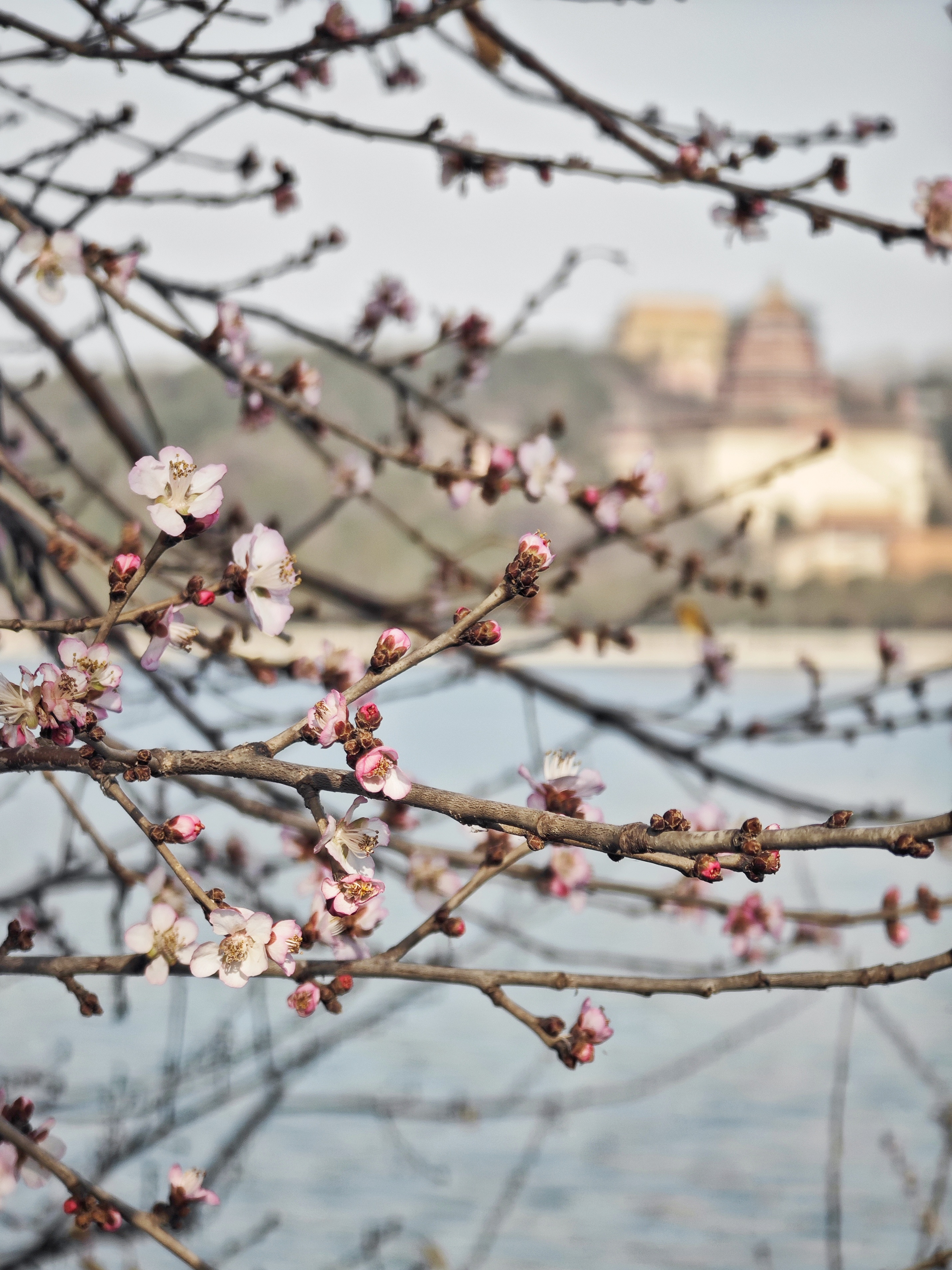 11月末的北京,昆明湖的风裹着寒意,西堤的柳叶早成了枯黄色——可临水那株山桃,偏要在冬天里“闹春”。粉白的花瓣探向冰蓝的湖面,连玉峰塔都成了它的背景板,游客举着手机挤成圈:“这是把冬天当三月了?”
