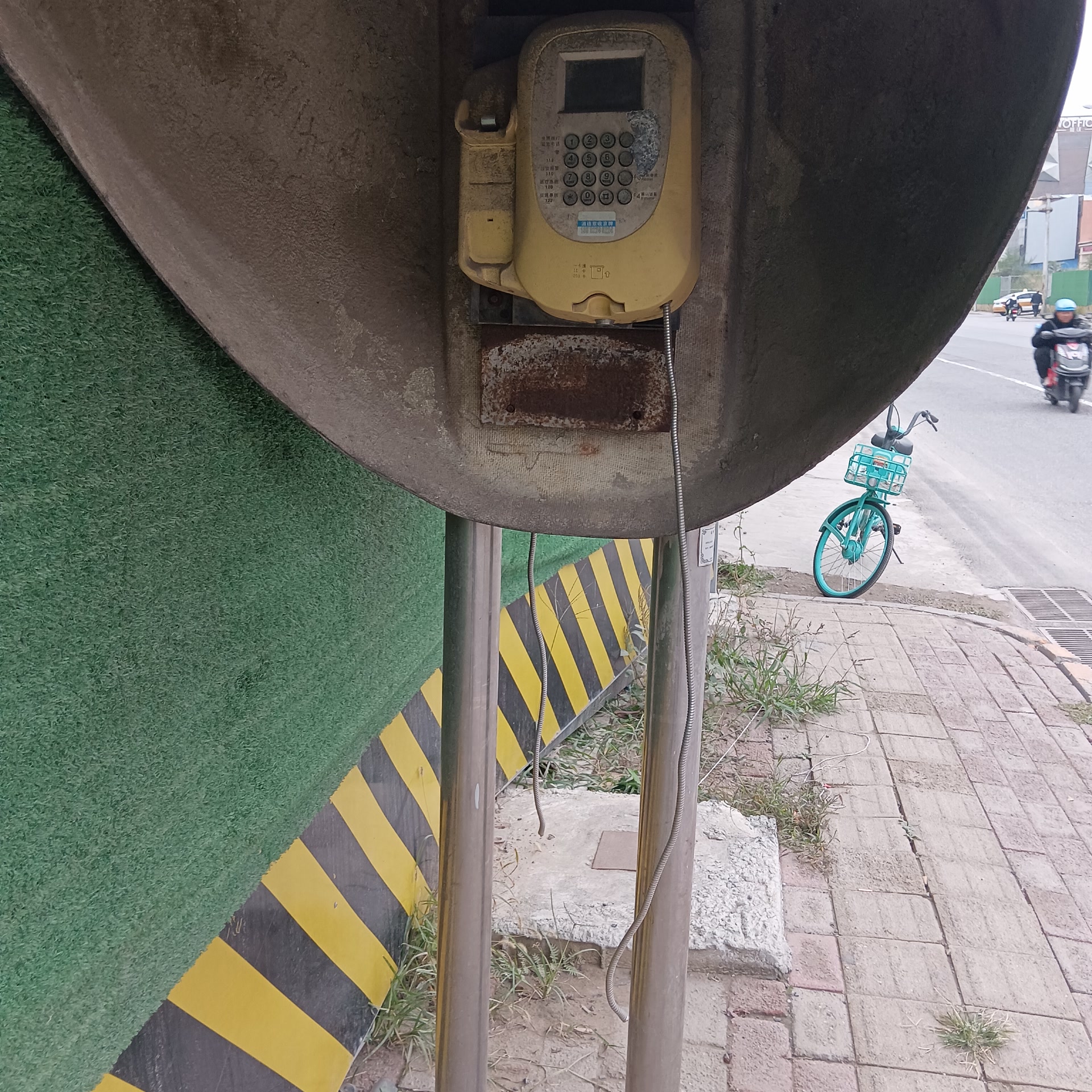 在大羊坊路十八里店乡政府公交站旁,有一个公共电话亭。近日笔者经过时看到该电话亭位于人行道上,道路本身较窄,公共电话亭便占了一半。走近查看发现,该电话亭十分破旧,内外都落满灰尘,油漆已经脱落,锈迹斑斑。内部设备老化,已经看不清电话机按键上的文字说明,按键下方还贴着小广告。两侧电话机的话筒都已丢失,只剩电话线垂落在下面,显然电话已无法使用。