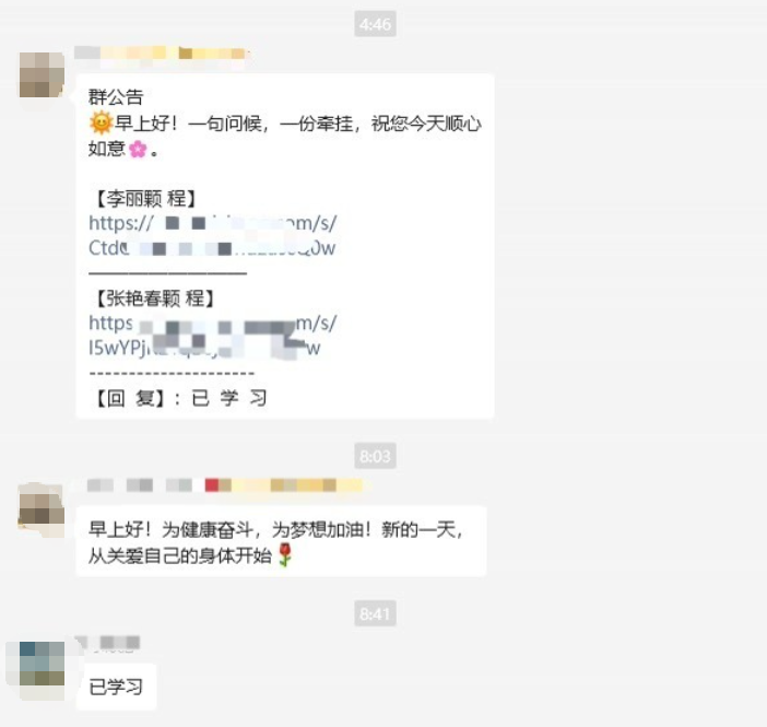 记者发现,这些养生群的运行模式都非常相似。每天,群主都会发布好几门课程信息,号召老人“打卡上课”。而这些课程,过几天之后就无法查看,无形中给了老人一种“不看就可惜”的紧迫感。另外,“群主”还会要求老人每天看完之后在群里打卡回复。