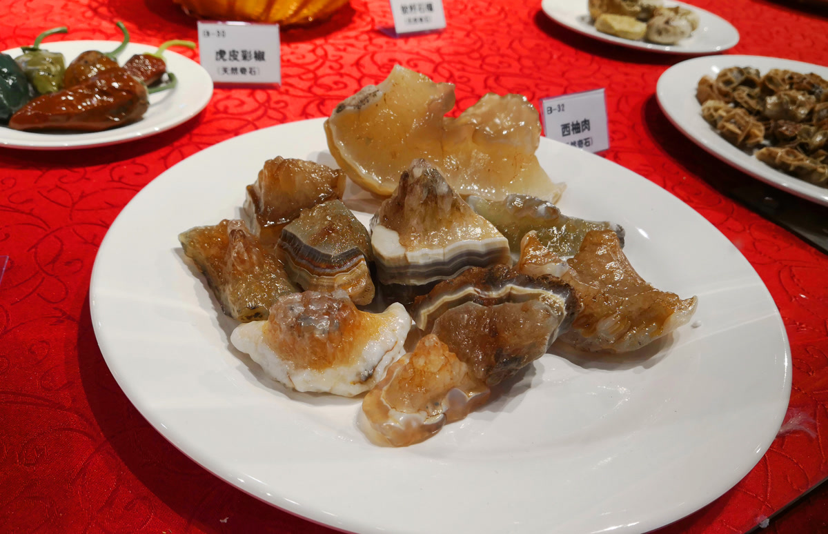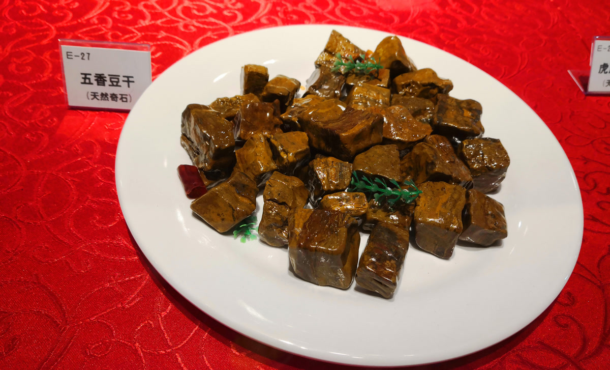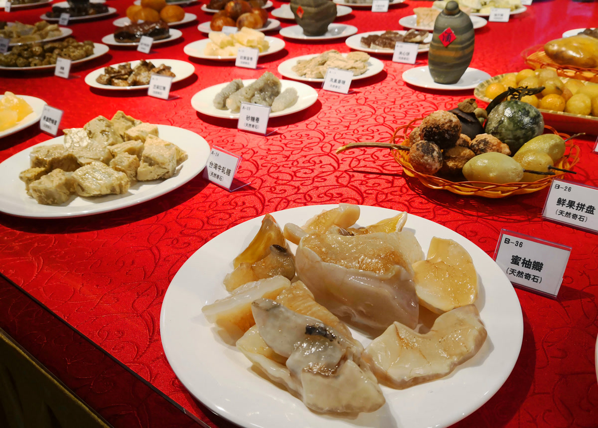 这桌“硬菜”,每一道都由天然奇石精心拼盘组合而成。这些奇石历经上亿年的自然锤炼,未经任何人工雕琢,却凭借其独特的形状与色彩,化身为栩栩如生的“美食”。从“红烧肉”到“清蒸鱼”,从“点心拼盘”到“山珍海味”,每一道“菜”都惟妙惟肖,让人忍不住想举箸品尝。
